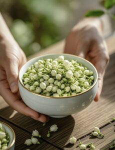 Jasmine is known as “the most fragrant flower under heaven”. When the jasmine season arrives, stepping into a jasmine bush allows one to experience the unique scene of “flowers blooming for a hundred miles, their fragrance spreading for ten thousand miles”. Its aroma is fresh, delicate, pure, and long-lasting. By mixing fragrant fresh flowers with new tea and steaming them together, after the tea absorbs the fragrance, the dried flowers are sifted out. The scented tea made in this way has a rich fragrance and a dark-colored tea soup.